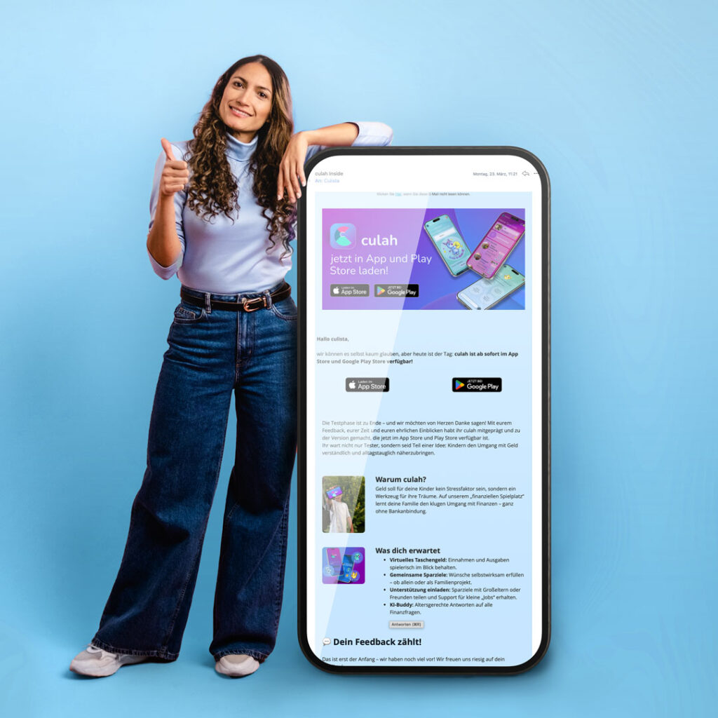 Mit der culah App setzt du altersgerechte Impulse, ihr legt gemeinsam Sparziele an, verteilt eure Aufgaben und macht echte Lernerfolge sichtbar.